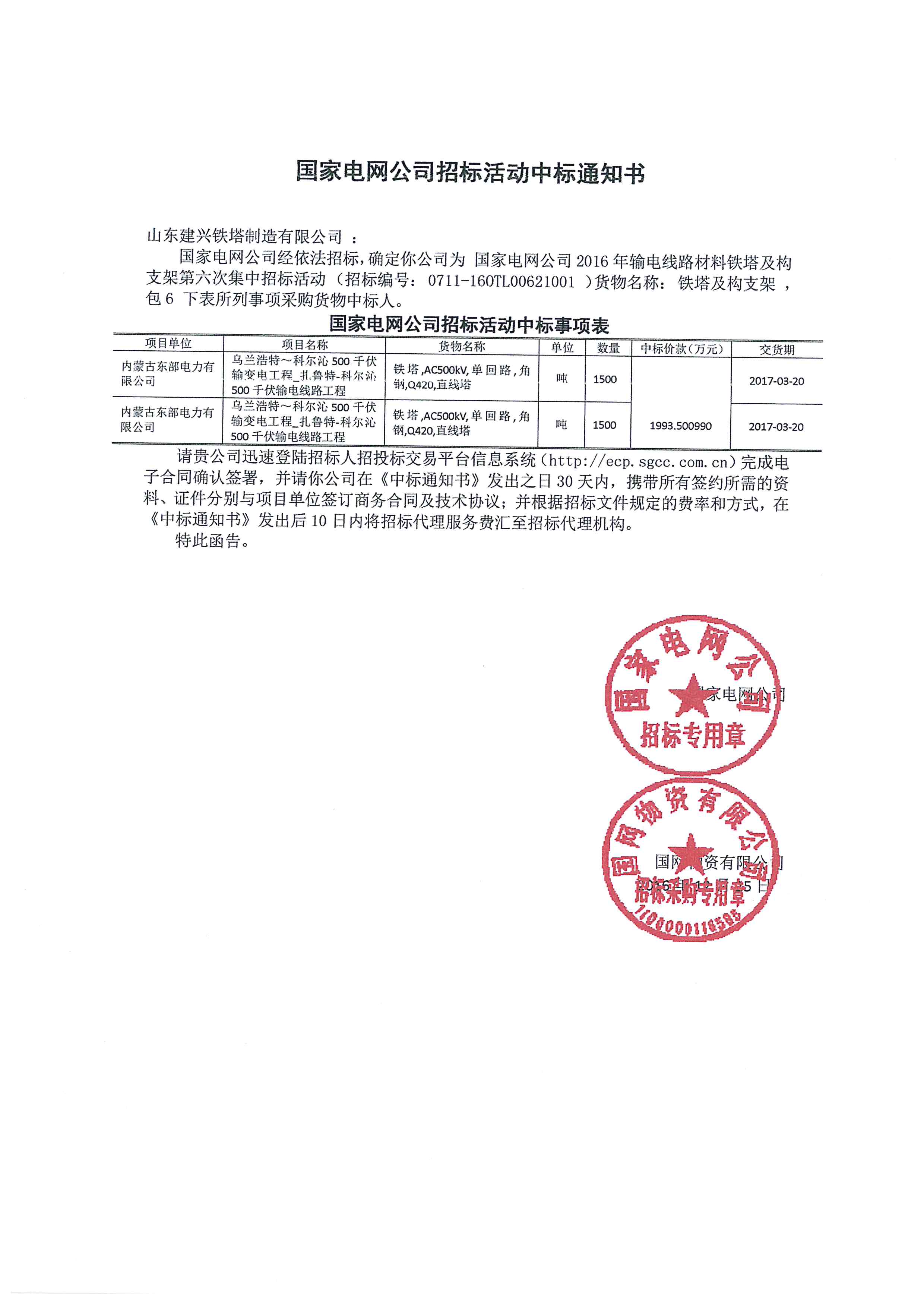 我公司在2016年国家电网公司第六批集中招标采购活动中中标