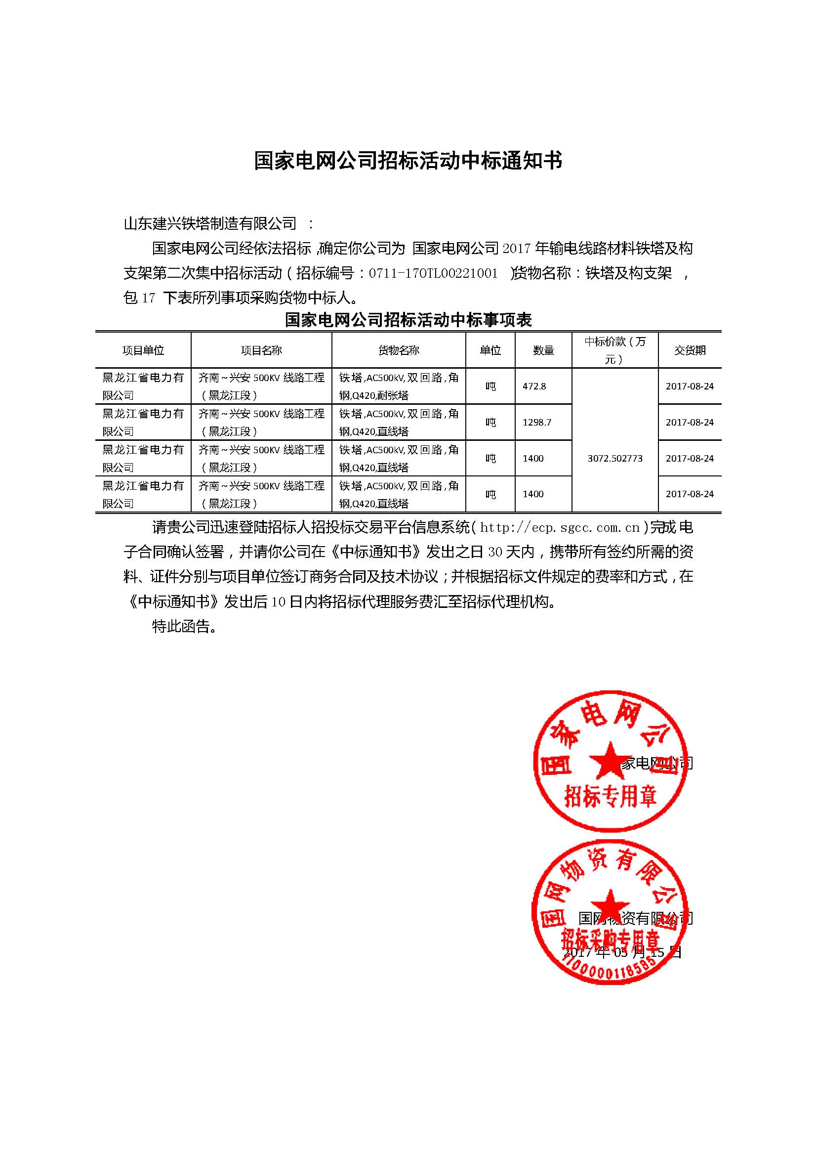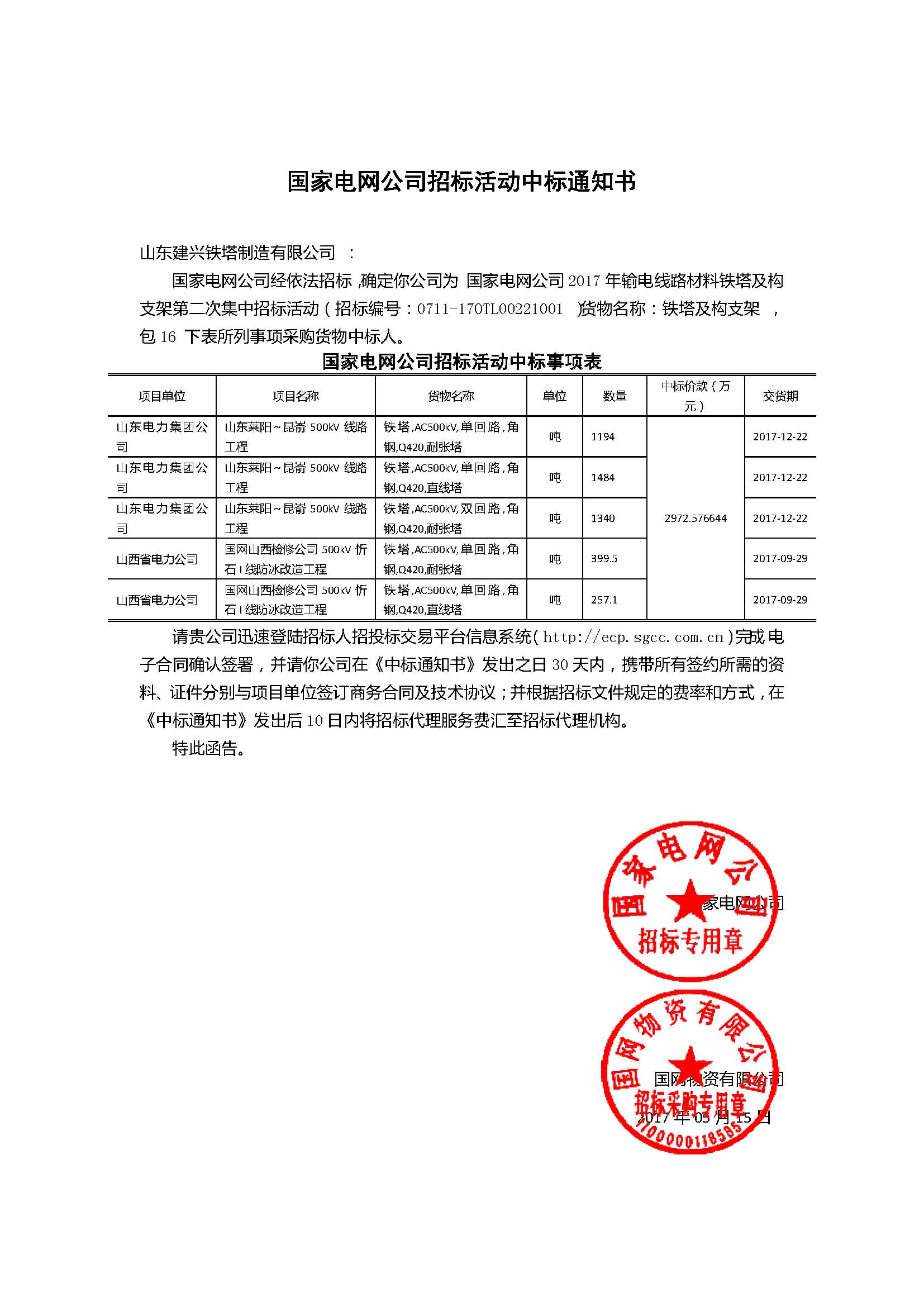 我公司在2017年国家电网公司第二批集中招标采购活动中中标