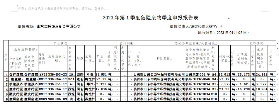 2023年第1季度危险废物季度申报报告表